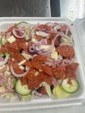 Iceberg lettuce, tomato, cucumber, red onion, black olives, capicola, ham, salami, provolone cheese, oil & vinegar dressing.